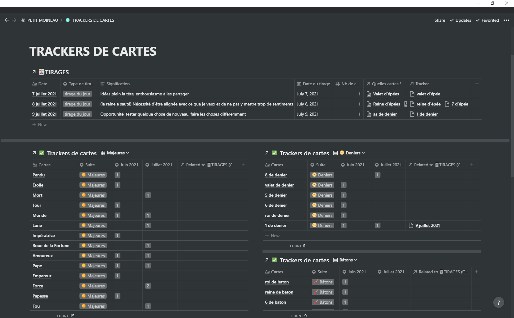 Et enfin, parce que j’aime pousser le vice, je me suis amusée à faire une autre base de données pour compter le nombre d’occurrences de chaque carte par mois. Celle-ci est à part car je compte tous mes tarots et ils ne sont pas sur mon espace Notion.